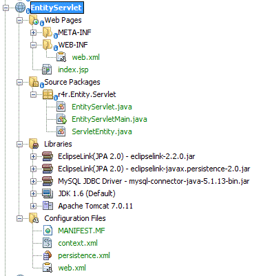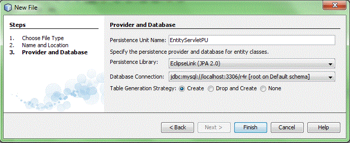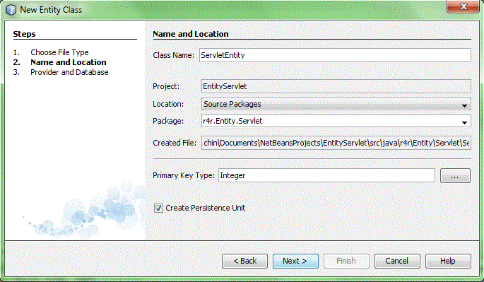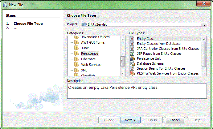 Step-1 Create a new web project and name it as EntityServlet. Go to source package and name it as r4r.Entity.Servlet, now right click over package and go to New -> other ->New File, window open (as show into below picture). Now choose Persistence from the Categories list and and Entity Class from File Types list, then click on Next button.